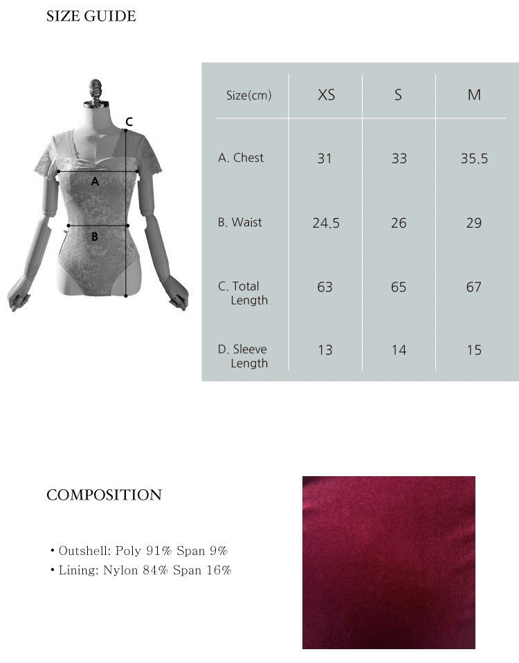 商品詳情 ◆設計製造:韓國 ◆注意:尺寸依照每人身形不同,穿上身效果會不同 此品牌尺寸標示小提醒 本品牌的尺寸標示方式與一般常見品牌略有不同 標示會小一號,但實際穿著大小與一般尺寸相同 無版型篇大或偏小的問題!! 例如:✔ 標示 XS號 → 實際約為一般品牌的 S號✔ 標示 S號 → 實際約為一般品牌的 M號 韓國iilaire - Clare velvet Wine短袖舞衣 TWD $3,480 TWD $3,480