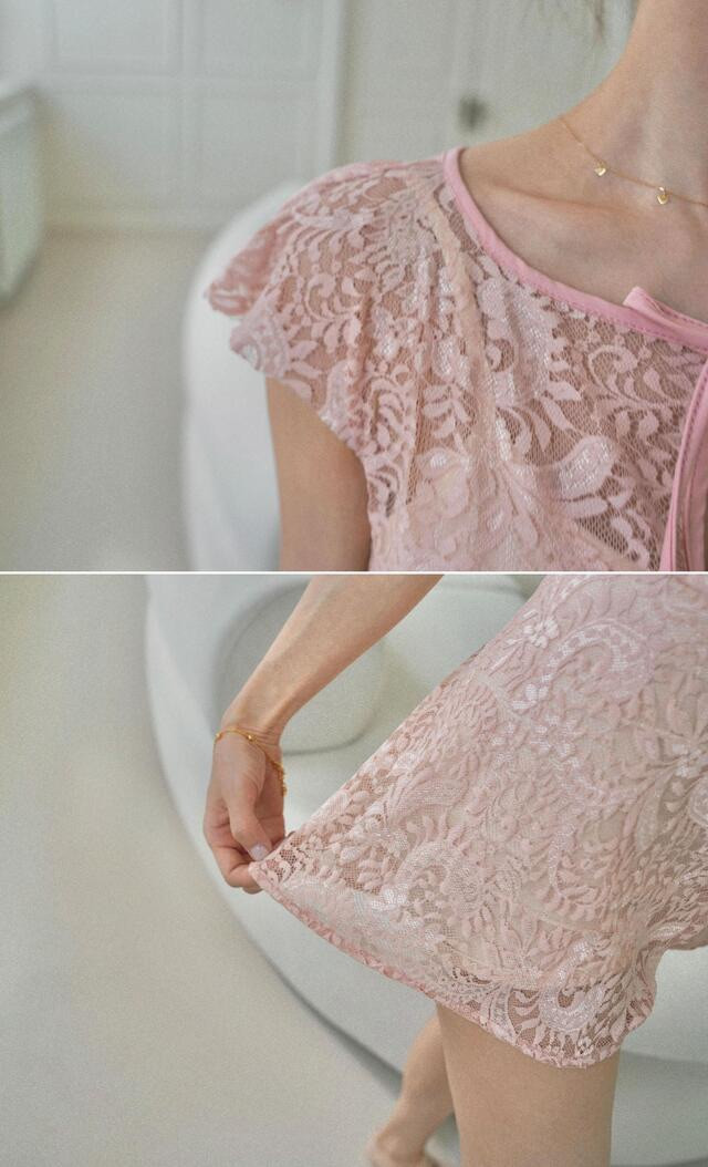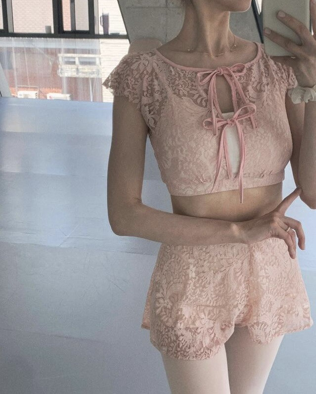 將原本的高腰下身設計升級為層層蕾絲荷葉裙短褲