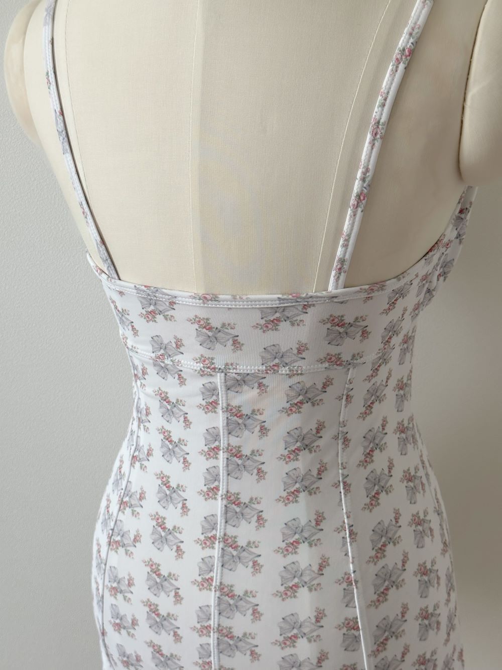 布料上點綴著小巧花朵與蝴蝶結組成的低調圖案