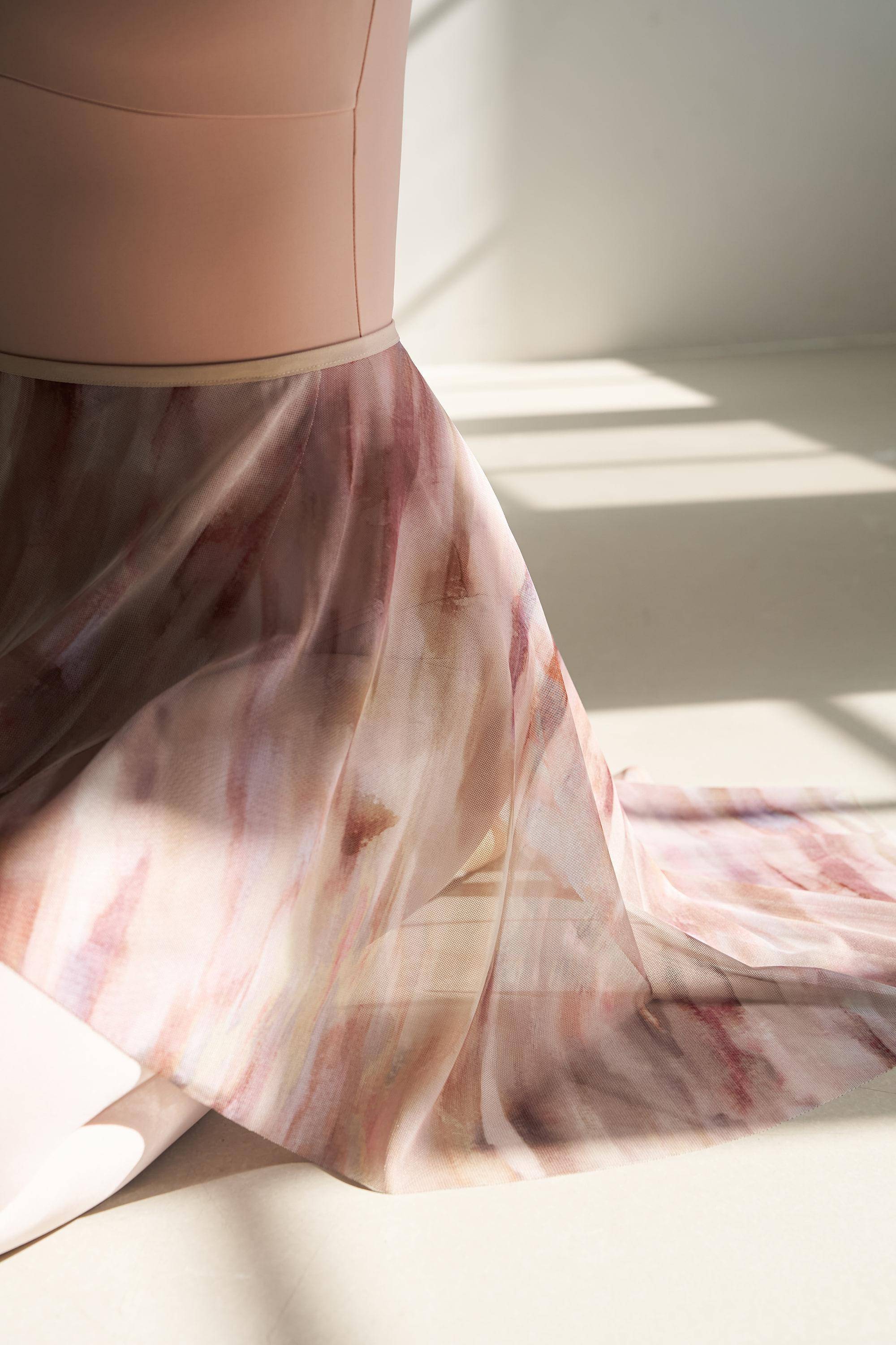 前方舞裙交疊的剪裁,加上前後長度的不對稱設計,展現優雅飄逸的氣質
